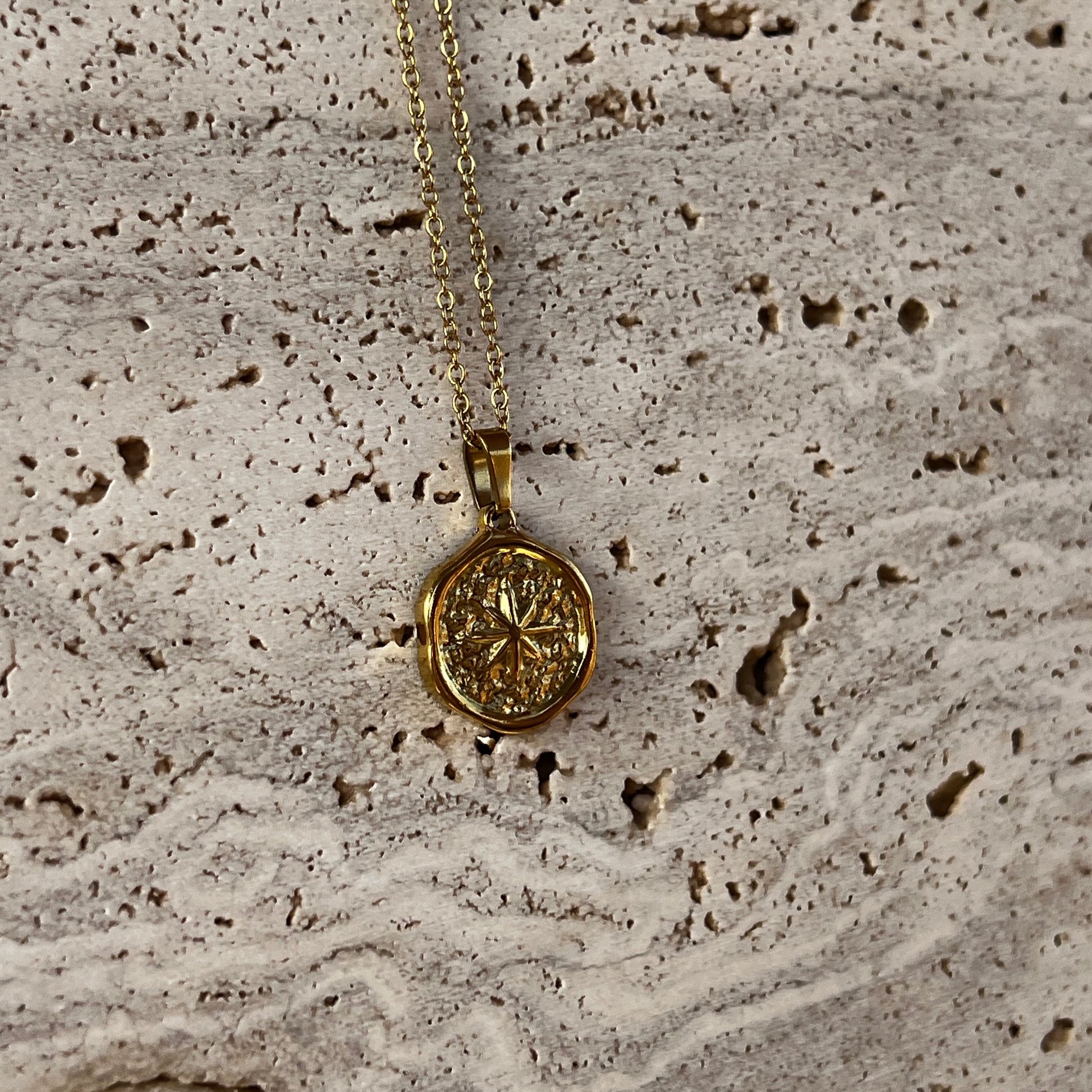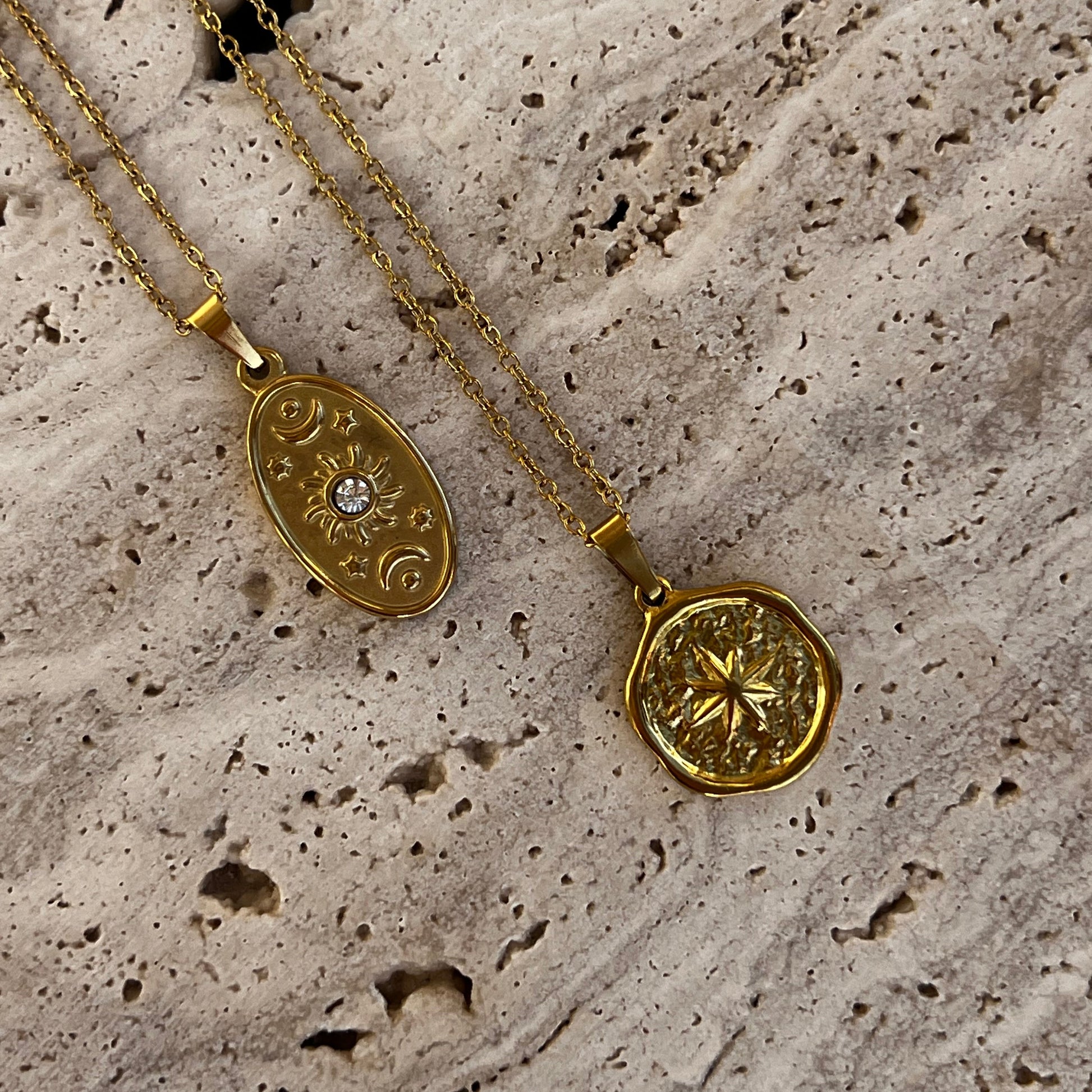 Colgante dorado con chapa redonda, con una estrella central que aporta un brillo sutil y atemporal.